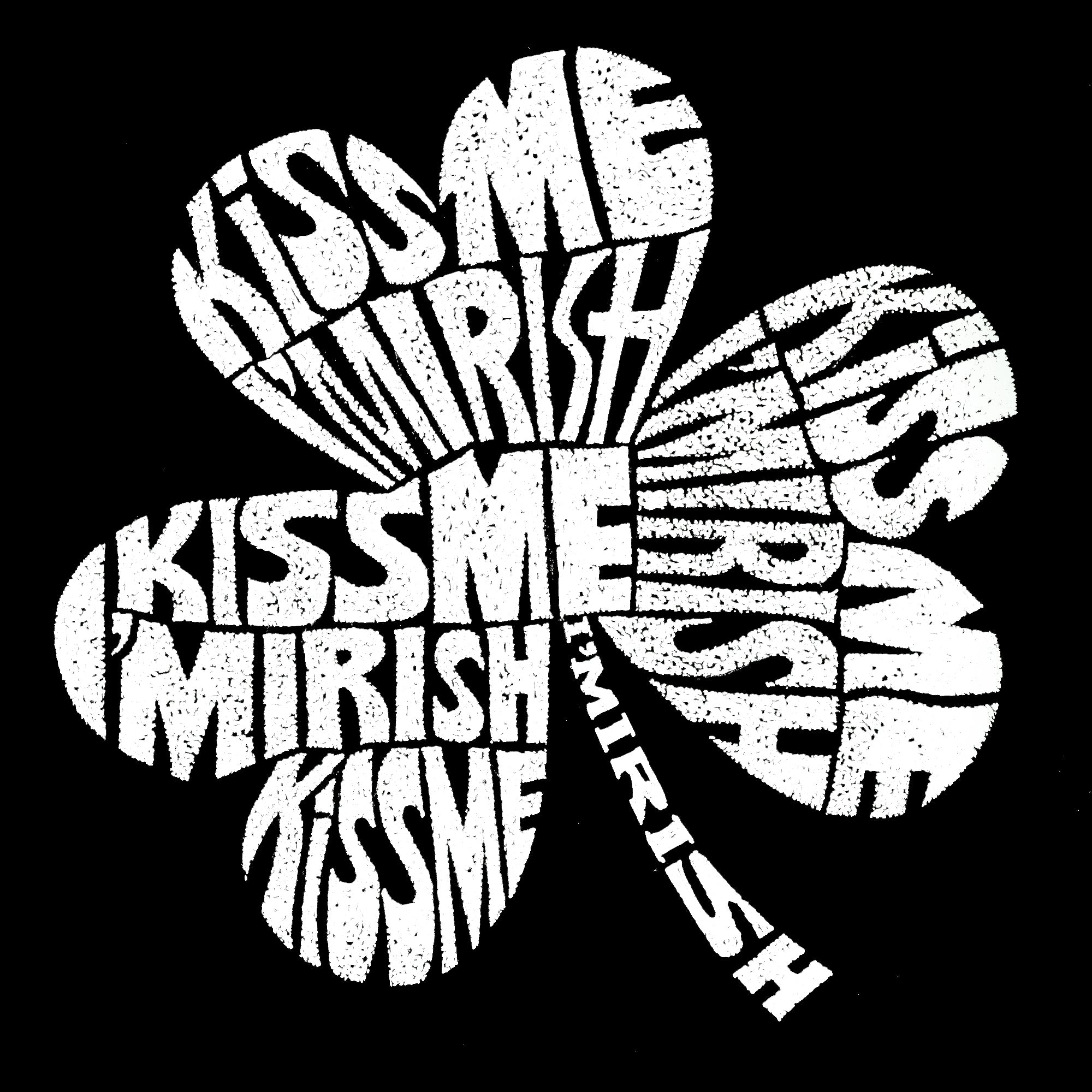 Created using the words "Kiss Me I'm Irish" Nobody is really sure on where this phrase originates from. Some say its a take on kissing the Blarney Stone for good luck, others think its a tagline the comes straight from the merchandisers on the street at NYC's St. Patrick Day Parade. Nonetheless, the phase has become part of both Irish and American pop culture. Taking this tagline and creating a cool, distorted Irish clover design seemed like a perfect fit.