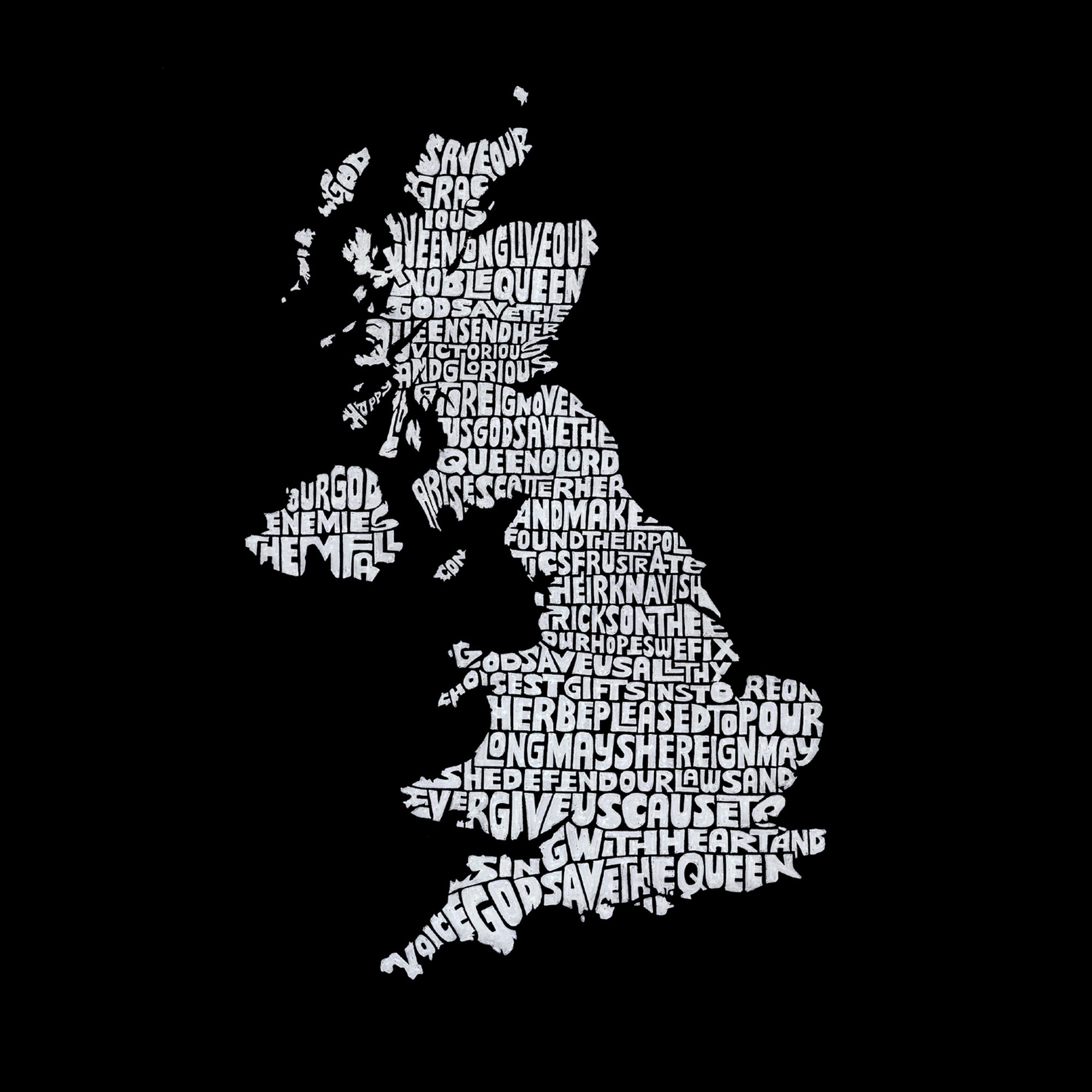 Created out of the lyrics to God Save the Queen God Save the Queen is the official National Anthem of The United Kingdom. The tune can be traced back to the 1600’s. While the queen currently hails, the lyrics all point to her. Interestingly enough, as soon as the queen passes the UK will enter into a period in which it will have its King. The lyrics will then change to God Save the King. All lyric references to “her” will be changed to “him.”This map of the United Kingdom is created out of the following lyrics which proudly celebrate its long and rich history. God save our gracious Queen, Long live our noble Queen, God save the Queen: Send her victorious, Happy and glorious, Long to reign over us: God save the Queen. O Lord, our God, arise, Scatter her enemies, And make them fall. Confound their politics, Frustrate their knavish tricks, On Thee our hopes we fix, God save us all. Thy choicest gifts in store, On her be pleased to pour; Long may she reign: May she defend our laws, And ever give us cause To sing with heart and voice God save the Queen