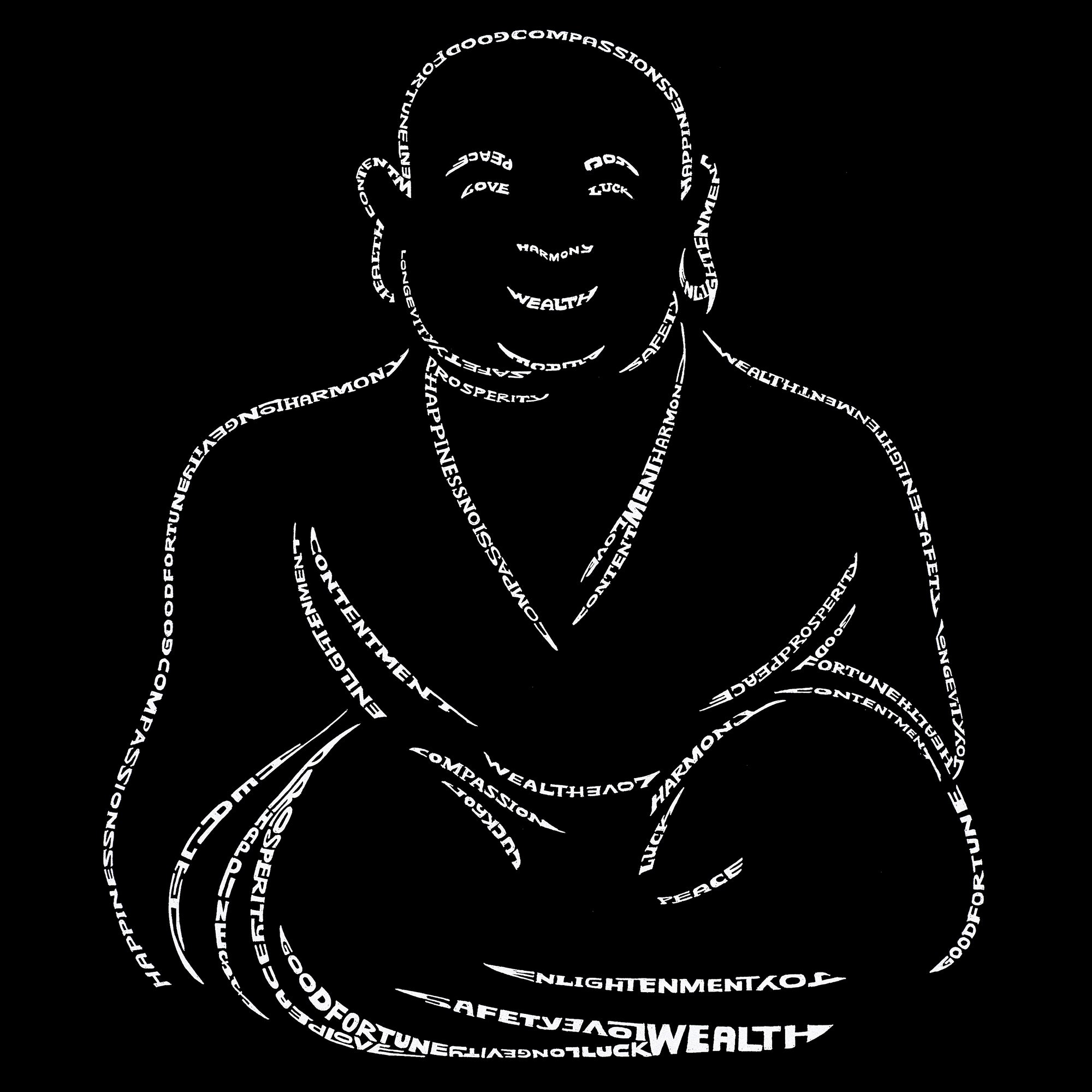 Created using popular types of positive wishes. For thousands of years, people have turned to Buddha statues, ornaments, artwork and even chants in hopes of walking away feeling enlightened and blessed. You can find little Buddha figurines in just about any store that people buy in hopes of bringing them good luck. Below is a list of positive wishes commonly associated with Buddah that we used to create this T-shirt. Who knows, perhaps if you purchase this shirt (actually if you purchase 20 shirts!) good fortunes may come your way Love Health Harmony Wealth Happiness Prosperity Luck Safety Compassion Good fortune Longevity Peace Enlightenment Joy Contentment Created using a list of positive wishes commonly associated with Buddha